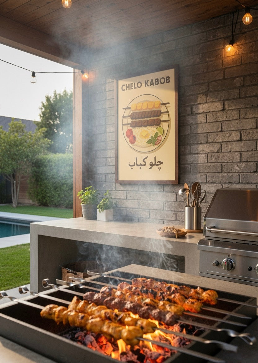 Transform your kitchen or dining space with this stunning Chelo Kabob poster, featuring Iran's most beloved grilled dish in beautiful vintage poster style. This Persian food art print is perfect for anyone who loves Iranian cuisine, Persian culture, or wants to add meaningful cultural decor to their home.